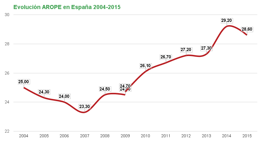 Transcorrida xa a metade do período previsto para a súa consecución, pode afirmarse que en España a pobreza e a exclusión social aumentou considerablemente. Entre os anos 2011 e 2015, o indicador europeo AROPE (que mide o risco de pobreza ou exclusión social) mostra un incremento de 1.062.084 novas persoas.