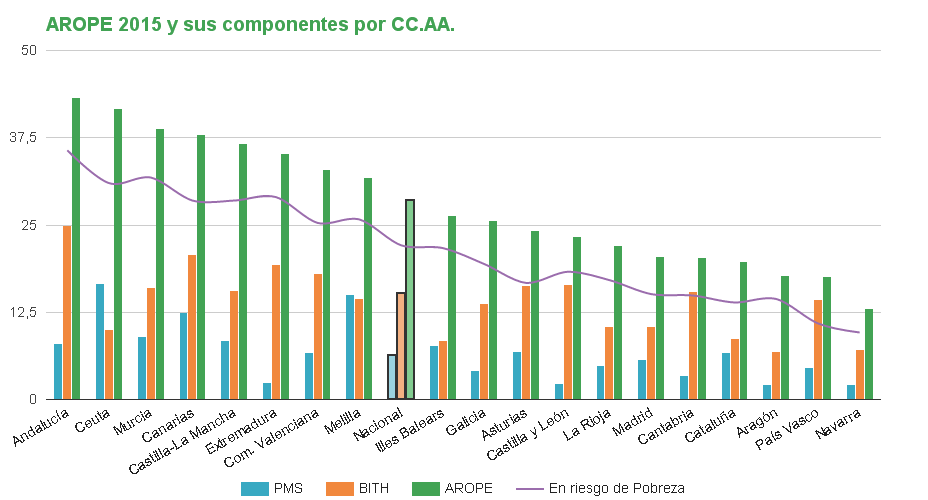 Neste senso, podemos destacar as diferenzas notables entre rexións como Andalucía e Ceuta coas taxas de AROPE máis elevadas (43,2 % e 41,7% respectivamente) e Navarra e País Vasco coas máis baixas (13% e 17,6% respectivamente)