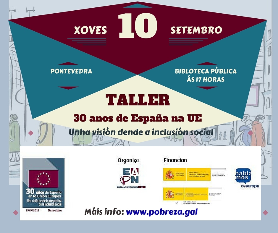 IMG_20150910_182034Onte, na Biblioteca Pública Nodal de Pontevedra e no marco do plan de preparación do Seminario de Participación de persoas en situación ou risco de pobreza e exclusión que se celebrará o vindeiro 20 de setembro en Barcelona, celebramos o taller “30 anos de España na UE: Unha perspectiva dende a inclusión social”.