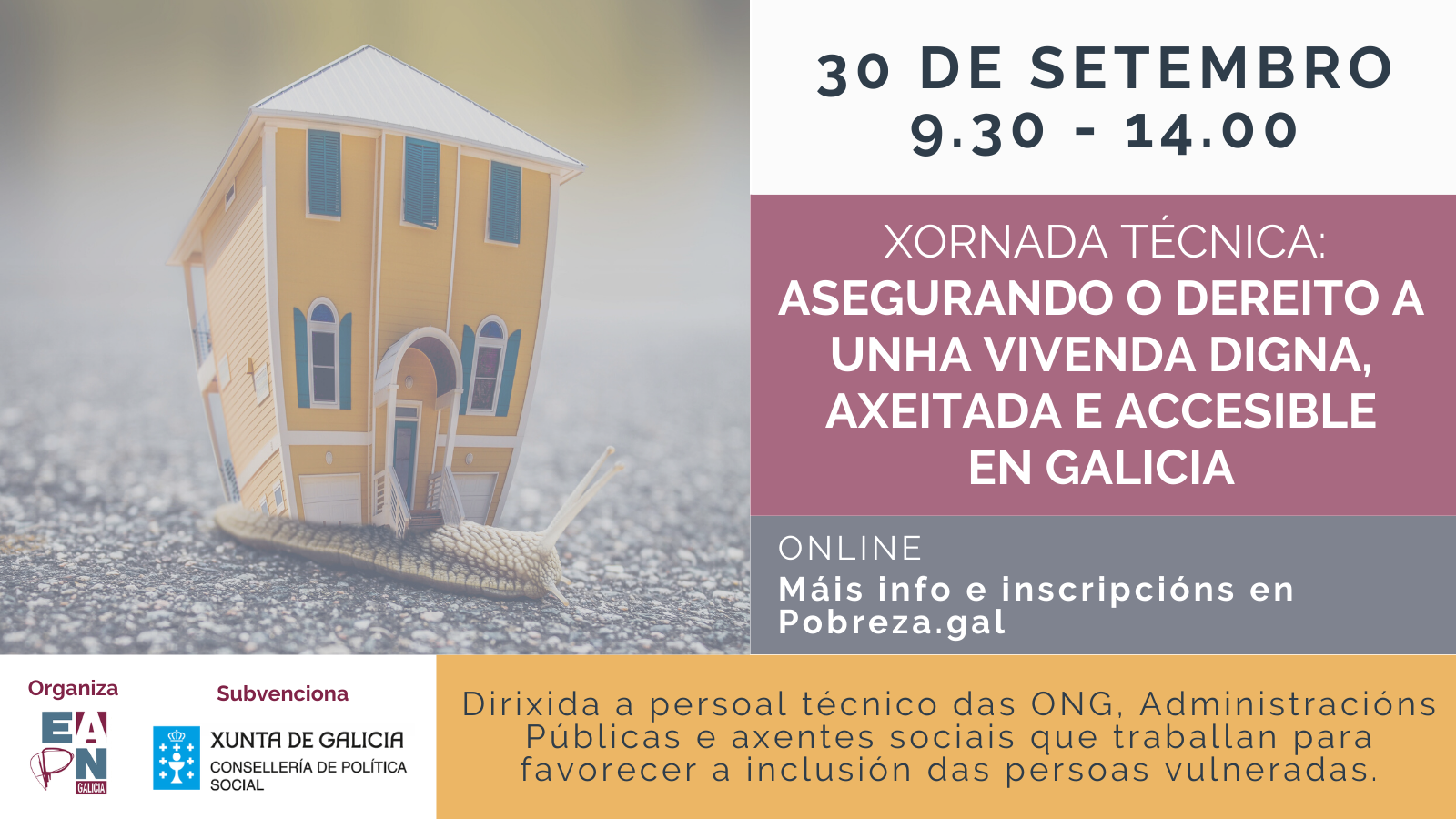 O 30 de setembro, EAPN Galicia organiza esta xornada técnica coa que pretende brindar un espazo de reflexión e diálogo entre profesionais das Administracións Públicas, entidades do Terceiro Sector e outros axentes sociais que traballan para favorecer a inclusión das persoas vulneradas. Nesta xornada xa está confirmada a presenza, entroutros, de representantes da Valedoría do Pobo, IGVS, Consellería de Política Social ou da Asociación Galega de Inmobiliarias (AGALIN)