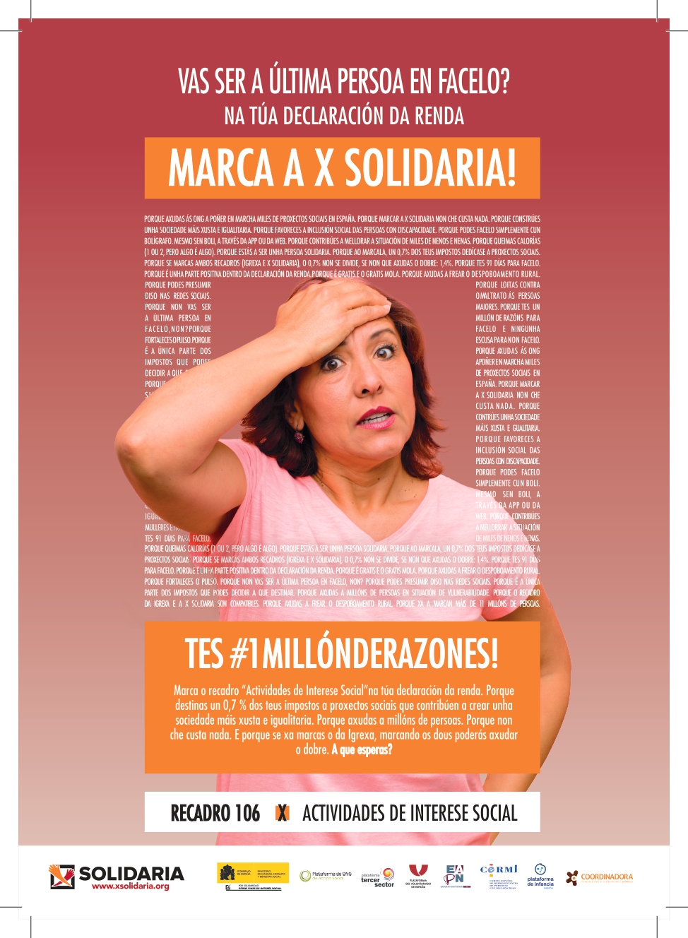 Con motivo das especiais circunstancias que estamos a vivir este ano, as entidades sociais queren animar a toda a cidadanía a que dende o 2 de abril enchan as redes sociais, as xanelas e os balcóns das súas vivendas con carteis animando a marcar o X Solidario, para despois subir unha foto ás redes coas etiquetas #XSolidaria e #1MillonDeRazones