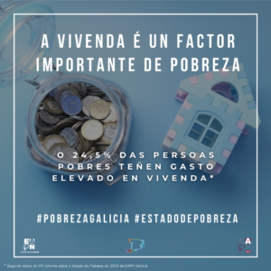 Todos os indicadores certifican a continúa emerxencia residencial e de acceso a unha vivenda digna, axeitada e accesible: o 24,5% das persoas en pobreza dedican mais do 40% da súa renda dispoñible a gastos de vivenda e no 2022 aumentaron de novo os fogares con retrasos no pago de gastos da súa vivenda, pasando do 9% no 2021 ao 9,4%.