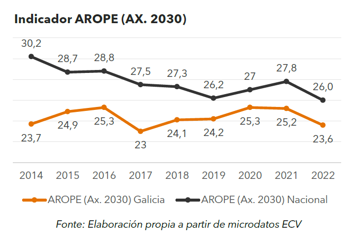 Os indicadores, en especial o de pobreza, mantéñense por debaixo dos do conxunto do estado, onde a taxa AROPE se reduce do 27,8% no 2021 ao 26% no 2022. Coa diminución de mais de 44.000 persoas da taxa AROPE dende o 2015, avánzase na meta do Plan Estratéxico Galicia 2022-2030 de reducir no 2030 ao 14% a taxa de risco de pobreza ou exclusión social. Pero pese a isto, Galicia mantense lonxe do cumprimento do acordado na Axenda 2030, para a cal, no 2022, tería que haber unhas 114.000 persoas menos en situación de risco de pobreza e/ou exclusión social.