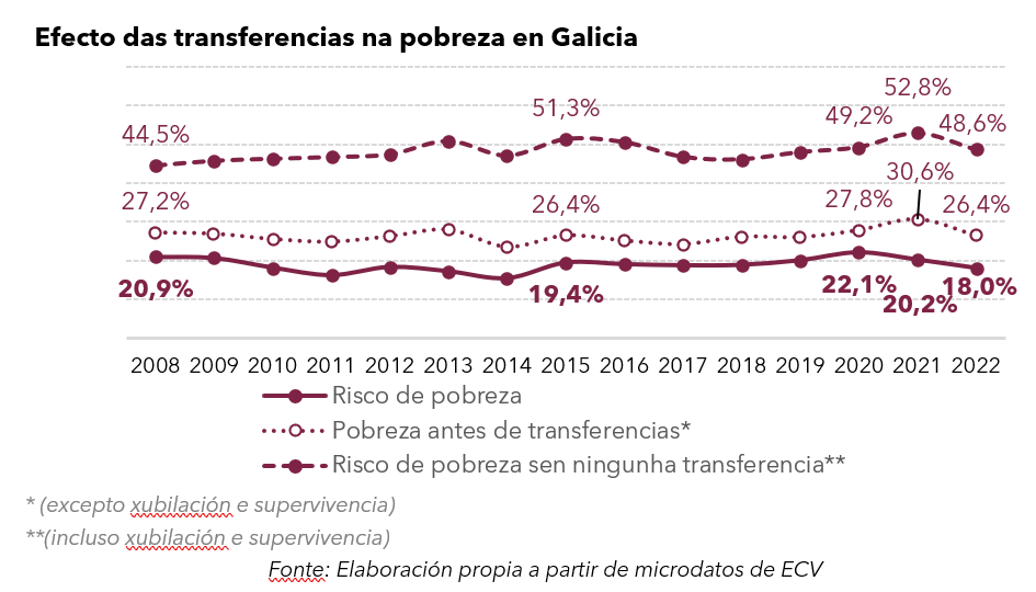 De non haber transferencias públicas (Estado, Xunta ou concellos) en Galicia, en 2022 a situación de pobreza ampliaríase a case a metade da poboación chegando ao 48,6%. Ademais, se non se teñen en conta as pensións de xubilación e supervivencia e so o resto de transferencias sociais, a taxa de pobreza alcanzaría a case 226.000 persoas mais, o 26,4 % da poboación galega.