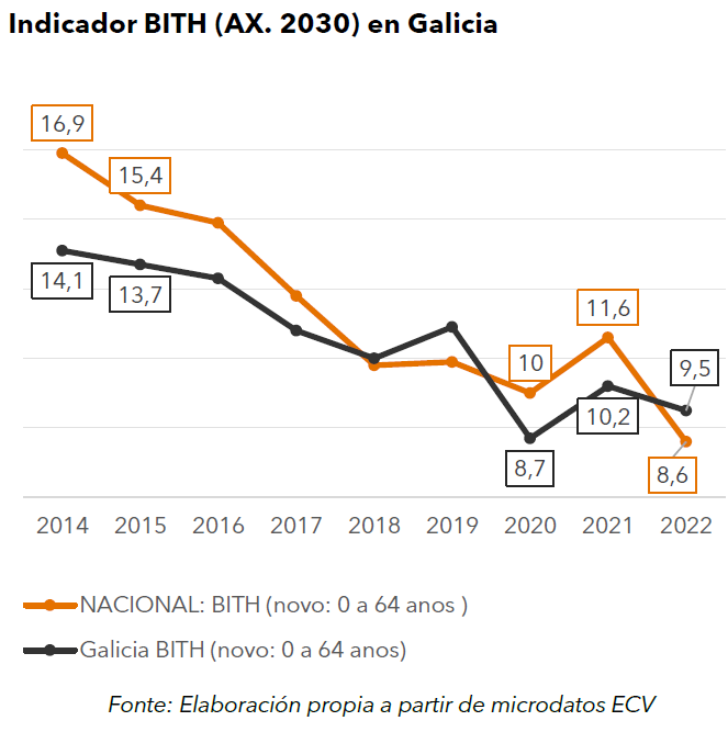 Por outra banda, na taxa BITH por sexo no 2022 aumentou a fenda de xénero, debido a que o descenso no último ano de 1,2 puntos da taxa masculina que se sitúa nun 8,3% non se produciu na feminina que chegou a un 10,6 % e que so caeu 0,2 puntos. En 2022 hai case 106.000 mulleres en BITH e 82.000 homes.