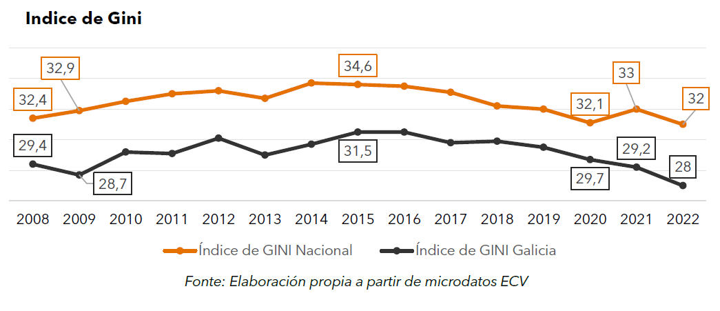 A redución da taxa de pobreza e as medidas de apoio á clase media e baixa permitiron mellorar os indicadores de desigualdade. O Índice de Gini galego baixou cinco puntos ata chegar ao valor 28, e mantívose inferior ao índice estatal, en concreto a 4 puntos deste último, sendo o galego o segundo máis baixo de 2022.