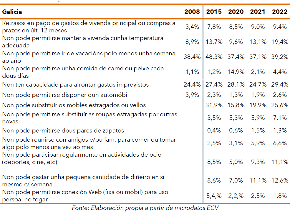 Empeoran 11 dos 13 items que compoñen este indicador. Aumentan as persoas que non poden permitirse manter a vivenda a unha temperatura adecuada alcanzando o 19,4 %, aquelas persoas que non teñen capacidade para facer fronte a gastos imprevistos que pasa dun 24,7% a un 29,7%, ou o incremento de persoas que non poden permitirse unha comida de carne, polo ou peixe cada dous días, que aumenta do 2,1 % ao 4,4%.