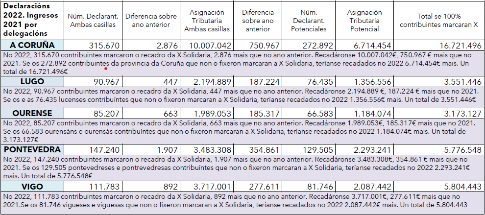 Na campaña do ano 2022, en Galicia 750.867 persoas marcaron a X Solidaria, 785 persoas máis que no ano anterior, recadándose un total de 21.391.293€.