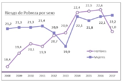Se xa a taxa AROPE das mulleres é 1,1 puntos superior á dos homes e a súa redución é moito mais lenta (baixou 0,8 decimas frente aos 2 puntos da masculina), a desigualdade é brutal e evidente nas taxas de risco de pobreza. Mentras a dos homes baixou do 22,6% ao 21% a das mulleres aumentou do 22,1% ao 22,2%.