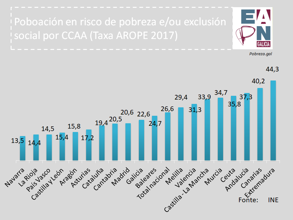 As taxas de risco de pobreza ou exclusión máis elevadas son en Extremadura (44,3%), Canarias (40,2%) e Andalucía (37,3%). As máis baixas en Navarra (13,5%), País Vasco (14,5%) e A Rioxa (14,4%) .