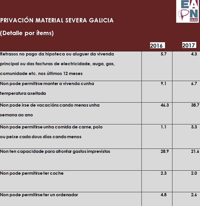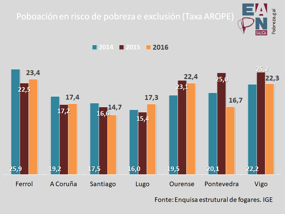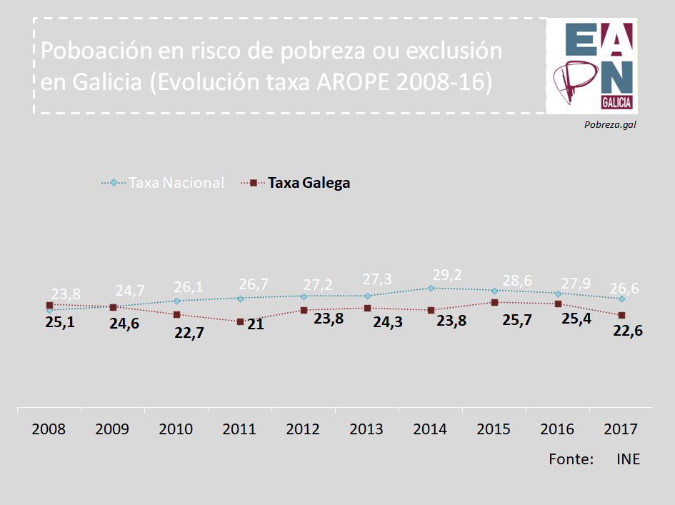 A recén publicada Enquisa de Condicións de Vida 2017 (ECV) publicada polo Instituto Nacional de Estatística (INE) trae algúns datos positivos en Galicia, pola baixada de todos os indicadores, ainda que a redución é lenta comparada co crecemento da economía e o temor fundado a que nunha nova crise económica a pobreza de moitas persoas voltaría a empiorar rápidamente. A porcentaxe de poboación en risco de pobreza ou exclusión (AROPE) baixou do 25,4% no 2016 ao 22.6% no 2017. 75.000 persoas menos (de 690.000 a 614.000).