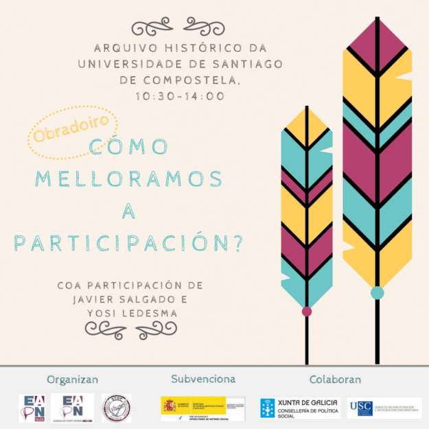 Cartel Seminario 160317O grupo de participación da EAPN-Galicia atópase en fase de reflexión sobre as posibilidades de expansión e mellora da participación das persoas en situación ou risco de pobreza e/ou exclusión a diferentes niveis: na propia EAPN e nas entidades que a forman, xa que todas elas teñen tamén procesos participativos na súa metodoloxía de traballo.