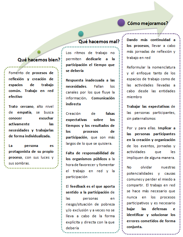 Avanzando na xornada, Yosehana Ledesma, coordinadora do grupo galego, dinamizou un debate que partía de tres preguntas clave: Qué facemos ben?, Qué facemos mal? E Cómo melloramos a participación? A continuación preséntanse as principais conclusións extraídas sobre a situación das entidades membro e a EAPN galega: