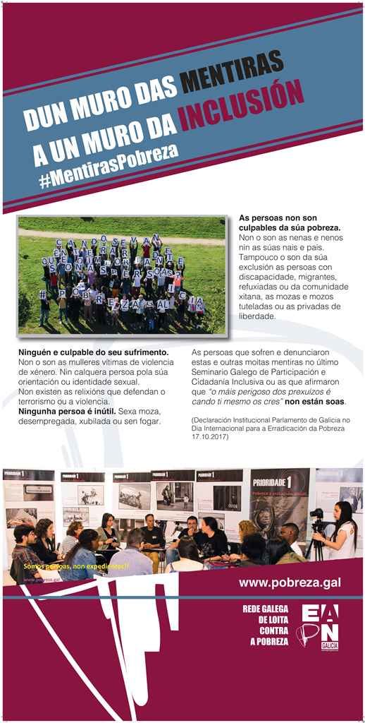 En paralelo á este acto e para reforzar a súa repercusión mediática, EAPN Galicia e as súa entidades membro lanzarán a campaña Mentiras Pobreza en redes Sociais desmentindo e argumentando contra as mentiras identificadas no Seminario de Participación ou transmitindo mensaxes e imaxes reais e en positivo sobre a realidade das persoas coas que se traballa.