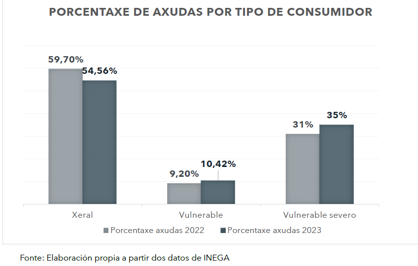 Según datos recogidos por EAPN-Galicia, la mayoría de los escritos pertenecientes a la convocatoria 2022, cerca del 80%, corresponden a ciudadanos no vulnerabilizados, el 6% a consumidores vulnerabilizados y casi un 13% a consumidores vulnerabilizados severos. En el 2023 la tendencia se mantuvo. Del total de solicitudes, 15.061 corresponden a consumidores generales, lo que supone un 77.5% del total; 1.349 a consumidores vulnerabilizados, que se baja hasta un 7% y 3.012 a consumidores vulnerabilizados severos, que supuso un ligero aumento, ya que corresponde al 15% del total.