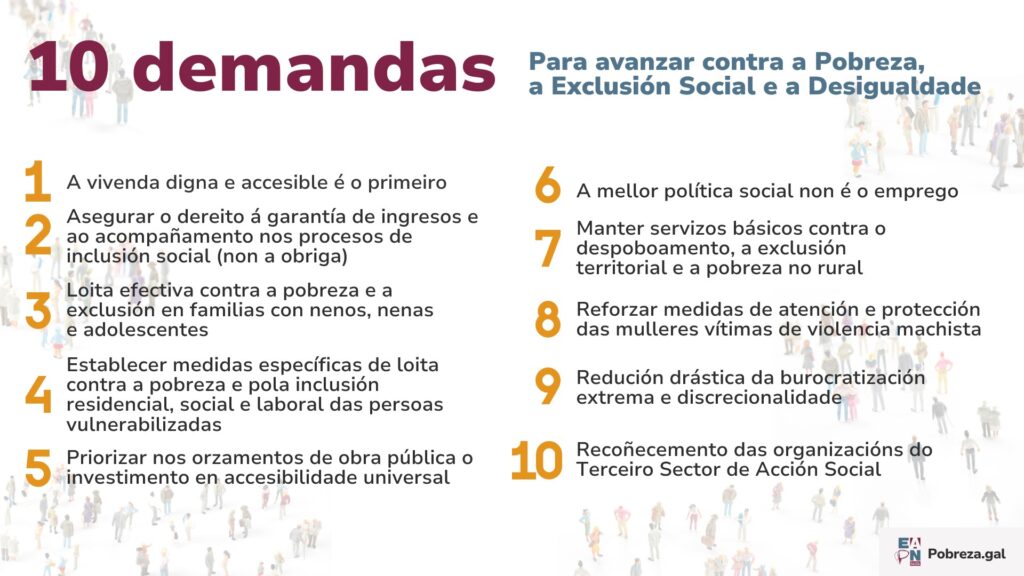 Incidimos en que o novo goberno que emane destas eleccións e as forzas políticas que compoñen o Parlamento Galego para a lexislatura 2024-2028 deben traballar conxuntamente para non dar marcha atrás en dereitos e políticas sociais, en colaboración con concellos, deputacións e coas organizacións da sociedade civil, cumprindo cos compromisos adquiridos na loita contra a pobreza e a exclusión social.