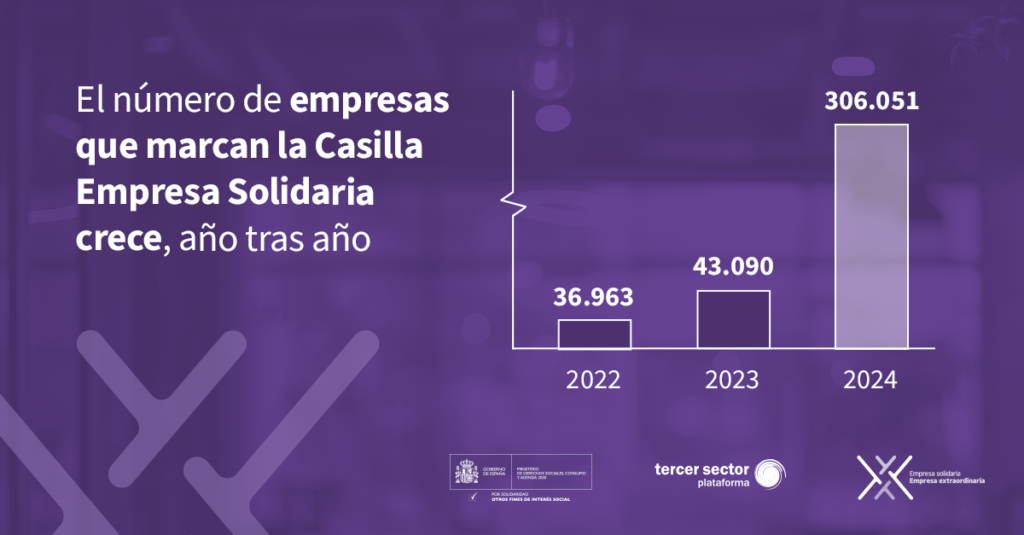 A nivel estatal os datos tamén experimentaron un aumento moi notorio. Na pasada campaña, 306.051 empresas marcaron a Casilla ‘outros caracteres – fins sociais’ dando como resultado unha recadación de 83.677.927 euros. Estes datos supuxeron un incremento exponencial en relación aos anos anteriores. Máis de 200.000 empresas novas sumáronse a esta iniciativa no 2024, significando un incremento do 600% (no exercicio de 2023 foron 43.090).