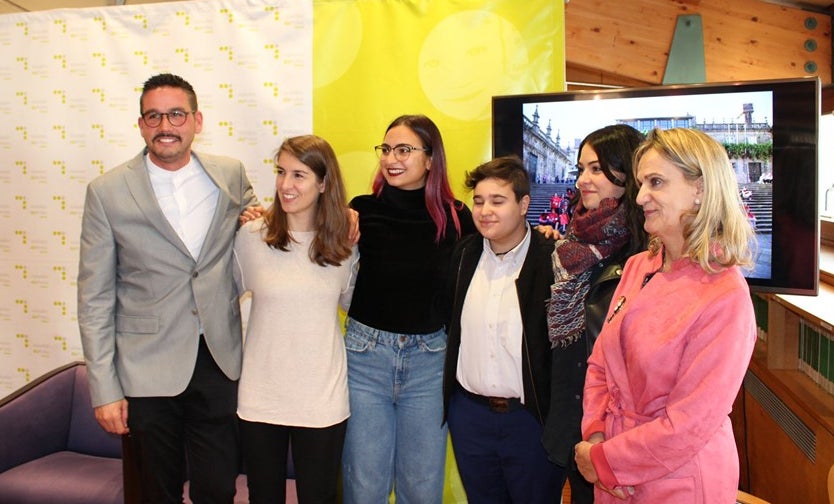 Daniel Bóveda, vicepresidente EAPN Galicia, Lara Rives e tres estudantes de Traballo Social e voluntarias, Eva Morales, Iago Aperador e Uxía Fernández, xunto á Valedora do Pobo, Dolores Fernández