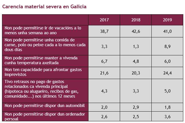 No 2019, o 3,6% da poboación de Galicia, vivía en condicións de Privación Material Severa, é dicir, non podía facer fronte polo menos a catro dos nove conceptos de consumo básico definidos a nivel europeo.