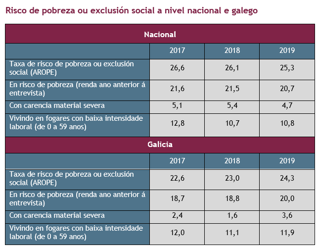No 2019, 655.000 persoas estaban en risco de pobreza ou exclusión social, o 24,3% da poboación galega, 1,3 puntos mais que no ano anterior.