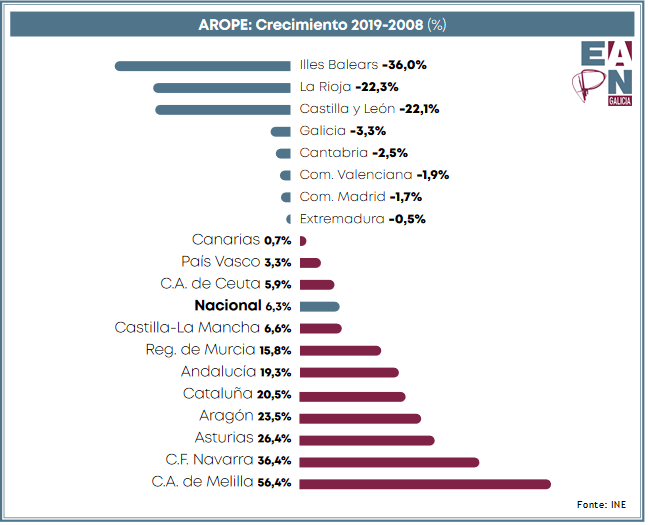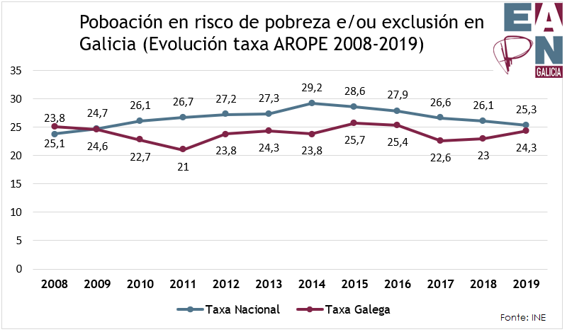 Galicia é unha das oito comunidades autónomas que ten conseguido reducir a súa taxa AROPE a cifras anteriores ás do comenzo da crise no 2008, do 25,1% no 2008 ao 24,3% no 2019.