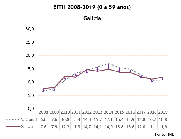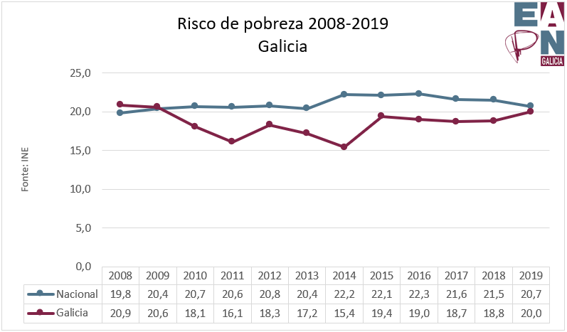 A taxa de risco de pobreza chega no 2019 ao 20,0% tras un incremento de algo máis dun punto porcentual: 540.729 persoas (31.623 máis que no ano anterior). Con todo, no conxunto do período entre 2008 e 2019 a taxa diminuiu 9 décimas, o que supuxo que 35.000 persoas saíran dunha situación de pobreza.
