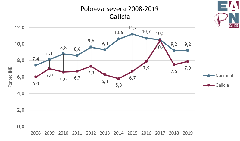 Galicia tiña no 2019 212.000 persoas en pobreza severa, 9.000 máis ca o ano anterior. Esto supón que o 7,9% da poboación galega tivo ingresos inferiores a 500€ ao mes nos fogares dunha persoa, 1.051€ ao mes nos fogares de dous adultos e dos menores de 14 anos ou menos de 951€ ao mes nun fogar monoparental nas que un adulto (no 80% dos casos unha muller) coida de tres menores.