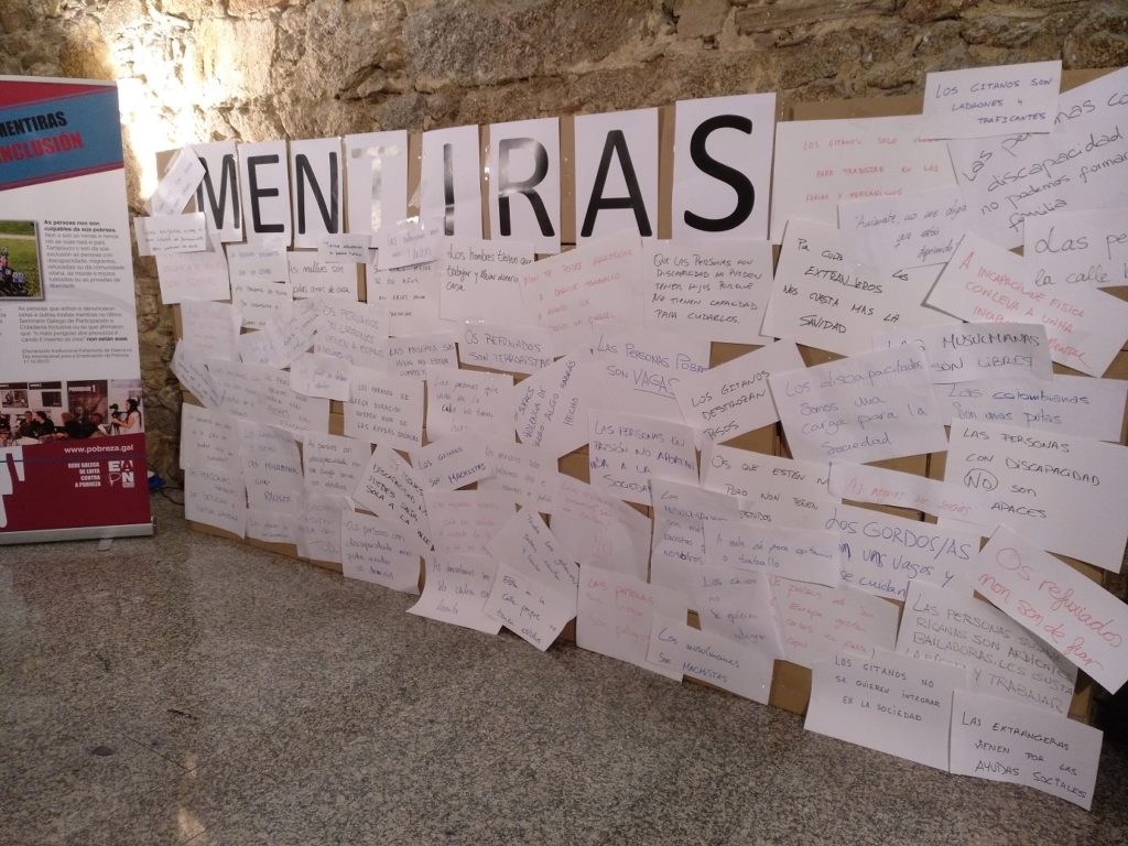 Esta implicación continuou no 2018 cando o Parlamento galego inaugurou a exposición ‘Dun muro das mentiras a un muro da inclusión’, elaborada coas mentiras e prexuizos que escoitan a diario as persoas mais vulnerables e coas propostas para loitar contra o odio e a aporofobia.