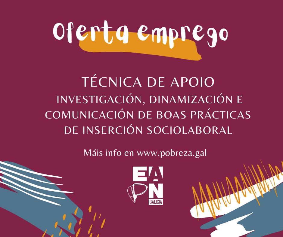 EAPN Galicia busca unha persoa para apoiar ás iniciativas e propostas de incidencia política para a inclusión de persoas en situación ou risco de pobreza ou exclusión social; así como na investigación, recollida e comunicación de boas prácticas de inserción sociolaboral e axudar a dinamizar e apoiar ás entidades membro da rede..