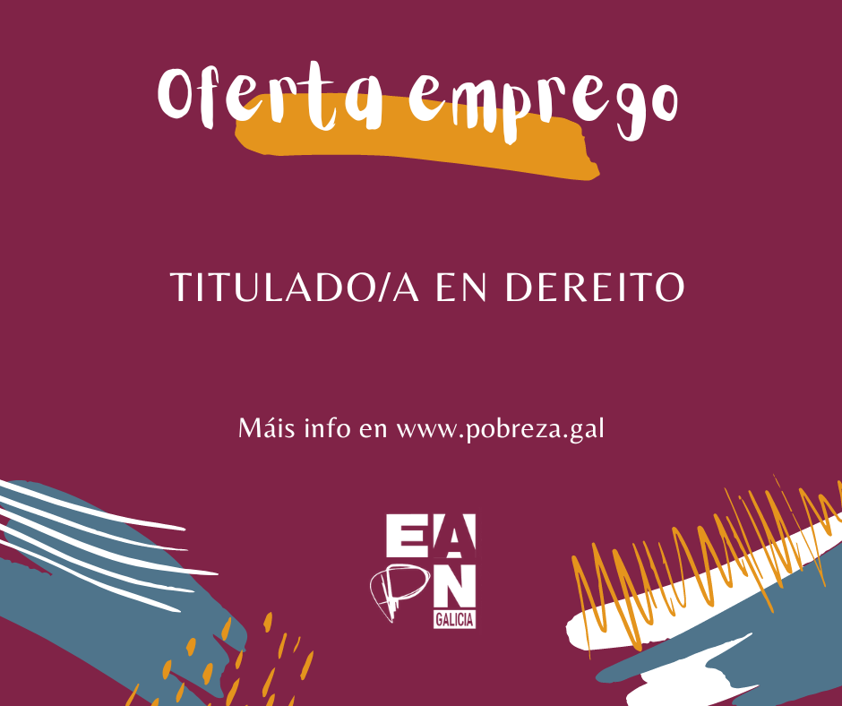 EAPN Galicia busca unha persoa titulada en Dereito, para formar parte da entidade durante 12 meses, exercendo funcións de reforzo e fomento da participación, inclusión sociolaboral, traballo en rede, análise de normativa e documentación xurídica e formación de persoas en pobreza, exclusión social e discapacidade.