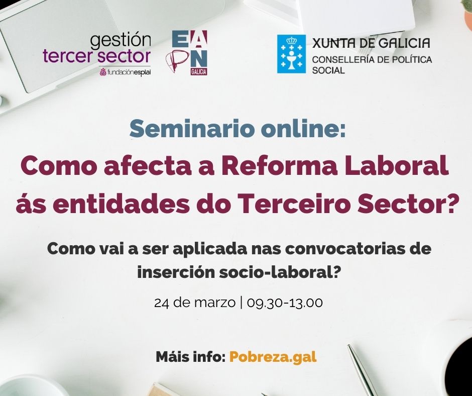 Neste seminario on line organizado por EAPN Galicia e a Fundación Esplai analizouse o impacto da reforma laboral nas contratacións de persoal nas entidades do Terceiro Sector e nas fomentadas nos diferentes programas de inserción sociolaboral de persoas en vulnerabilidade.