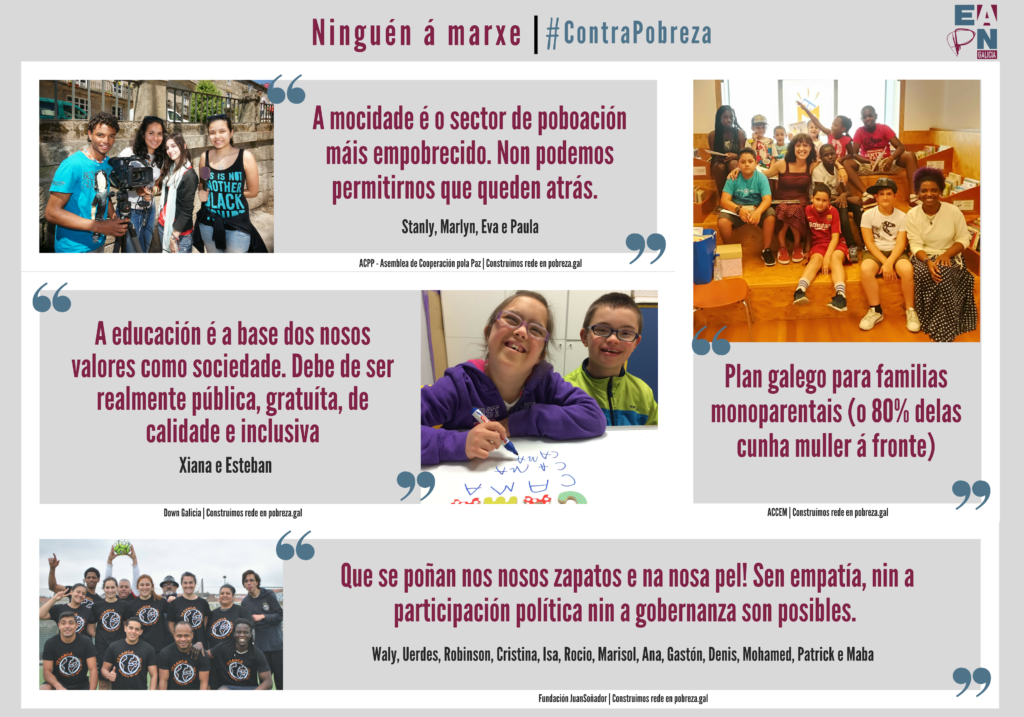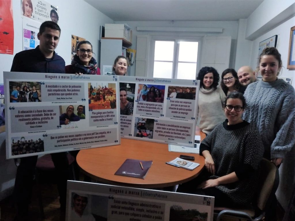 Traballo non vai faltar, pero a causa común que nos une ben paga a pena: “Somos entidades do Terceiro Sector de Acción Social implicadas na loita contra a pobreza, a exclusión e a desigualdade social e de xénero. Que traballa polas mesmas causas, desde un enfoque de dereitos pola defensa dos intereses das persoas en situación ou risco de pobreza e da súa participación comunitaria plena, mediante a incidencia política e social propositiva