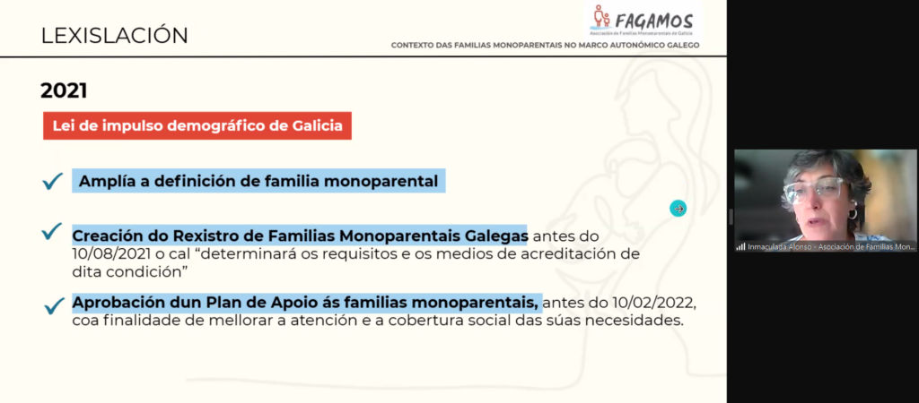 O seminario web contou coa presenza de Carmen Flores, presidenta da Federación de Asociacións de Nais Solteras (FAMS) e Inma Alonso da Asociación de Familias Monoparentais de Galicia (FAGAMOS) que contextualizaron a realidade das familias monoparentais no marco estatal e autonómico respectivamente. Presentaron datos preocupantes, coma que en España, a taxa de risco de pobreza e/ou exclusión social (AROPE) das persoas en fogares cun adulto e un neno, nena e adolescente foi do 50,3%, case duplicando o do total da poboación: 25,8%. A nivel galego, Inma Alonso advertiu que o 66,3% dos fogares monoparentais aseguran chegar con dificultade ou moita dificultade a final de mes, o dato máis alto de todos os tipos de fogar segundo os últimos datos do IGE.