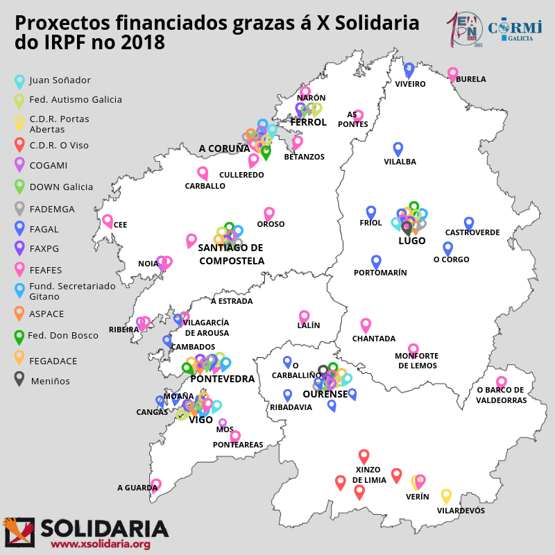 Mapa galego dos proxectos financiados grazas á X Solidaria do IRPF no 2018
