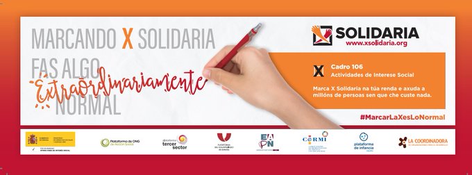 Coincidindo co inicio da campaña para a presentación da Declaración da Renda, as ONG galegas representadas por EAPN Galicia, Cermi Galicia e Plataforma de Organizacións de Infancia de Galicia, piden a colaboración da cidadanía para que marque o recadro 106 de “Actividades de Interese Xeral consideradas de Interese Social”, coñecido como X Solidaria.